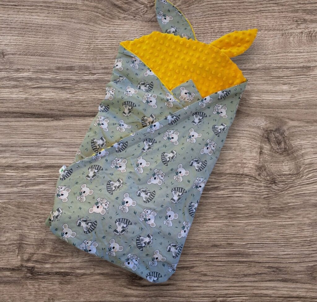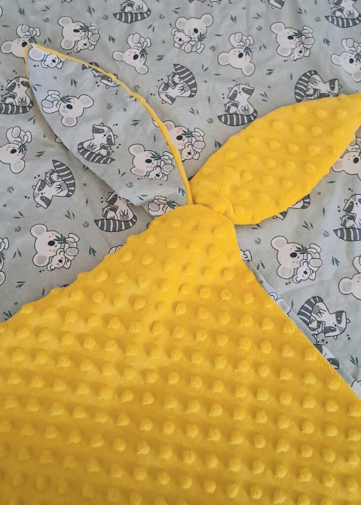 Je me suis amusée, avec les matières, les couleurs, le tissu imprimé koala dans les tons gris-vert clair et le Minky jaune ultra doux avec pois en relief