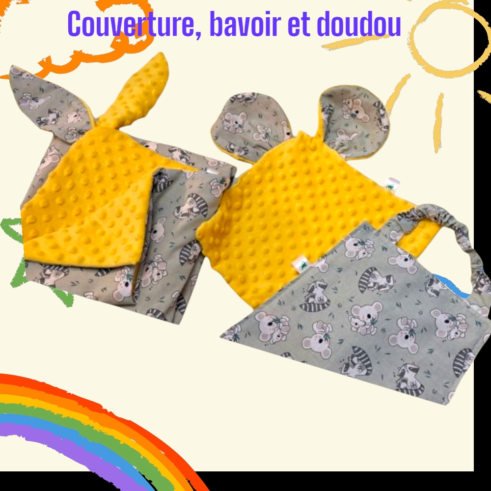 La couverture ( dimension 90cm x 107cm ) a de longue oreilles de lapin, le bavoir et le Doudou des oreilles de souris